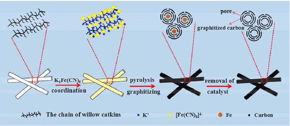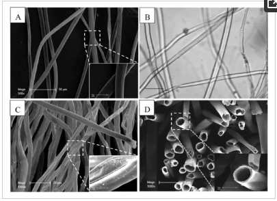 Electron microscope view of catkin hair tubes (from Wu et. al.) and diagram of process for converting organic catkin hairs into industrial tubes (from Zhang et. al.)