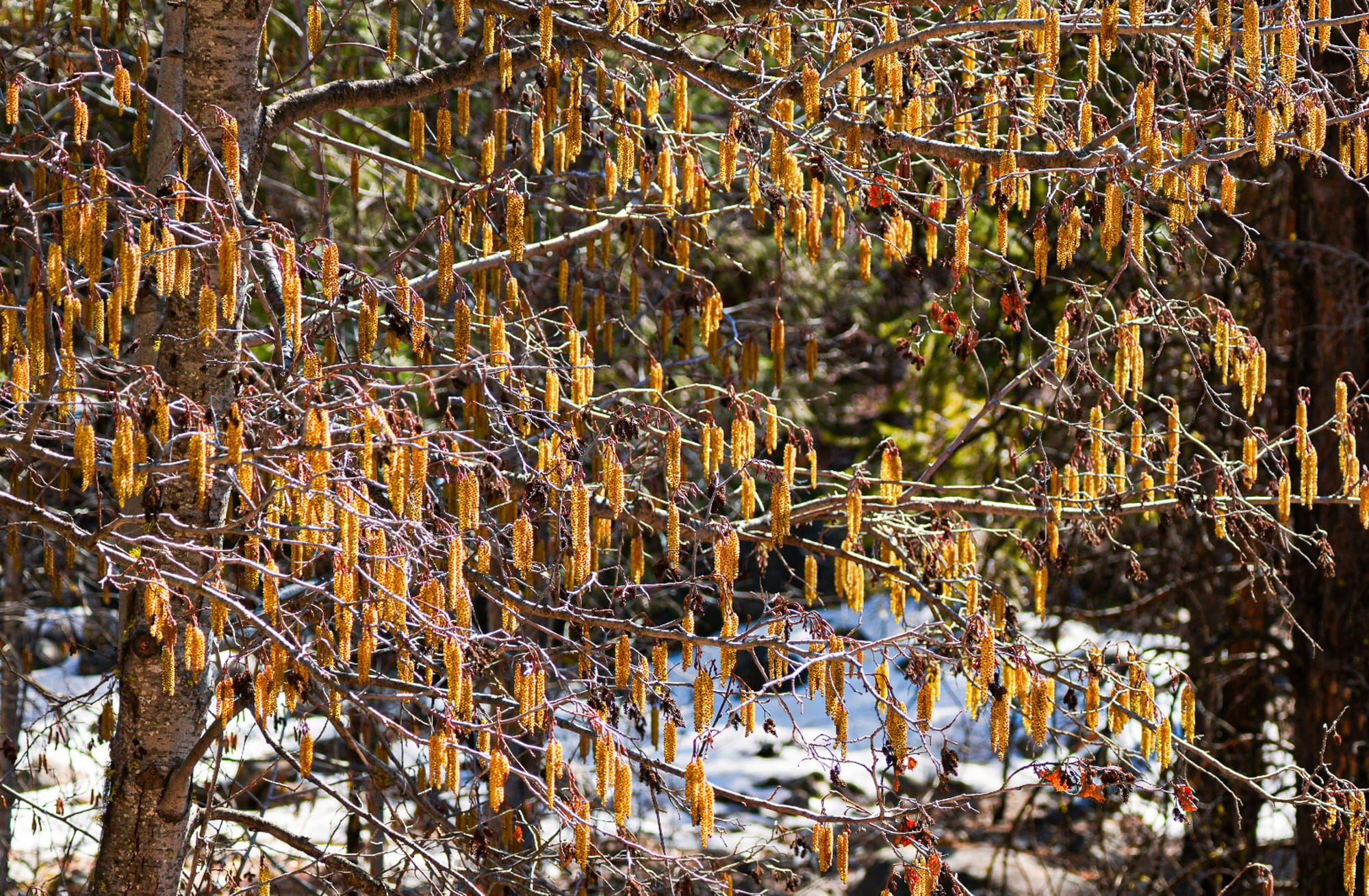 There's another hidden story here, and it has to do with the locations where these trees grow. Super abundant, catkin-bearing trees like willows, alders, birches, and cottonwoods line nearly every stream and river from timberline to valley floor, dropping their catkins into the water in early spring when the aquatic food chain is in greatest need of nutrients and leaves haven't started falling yet.