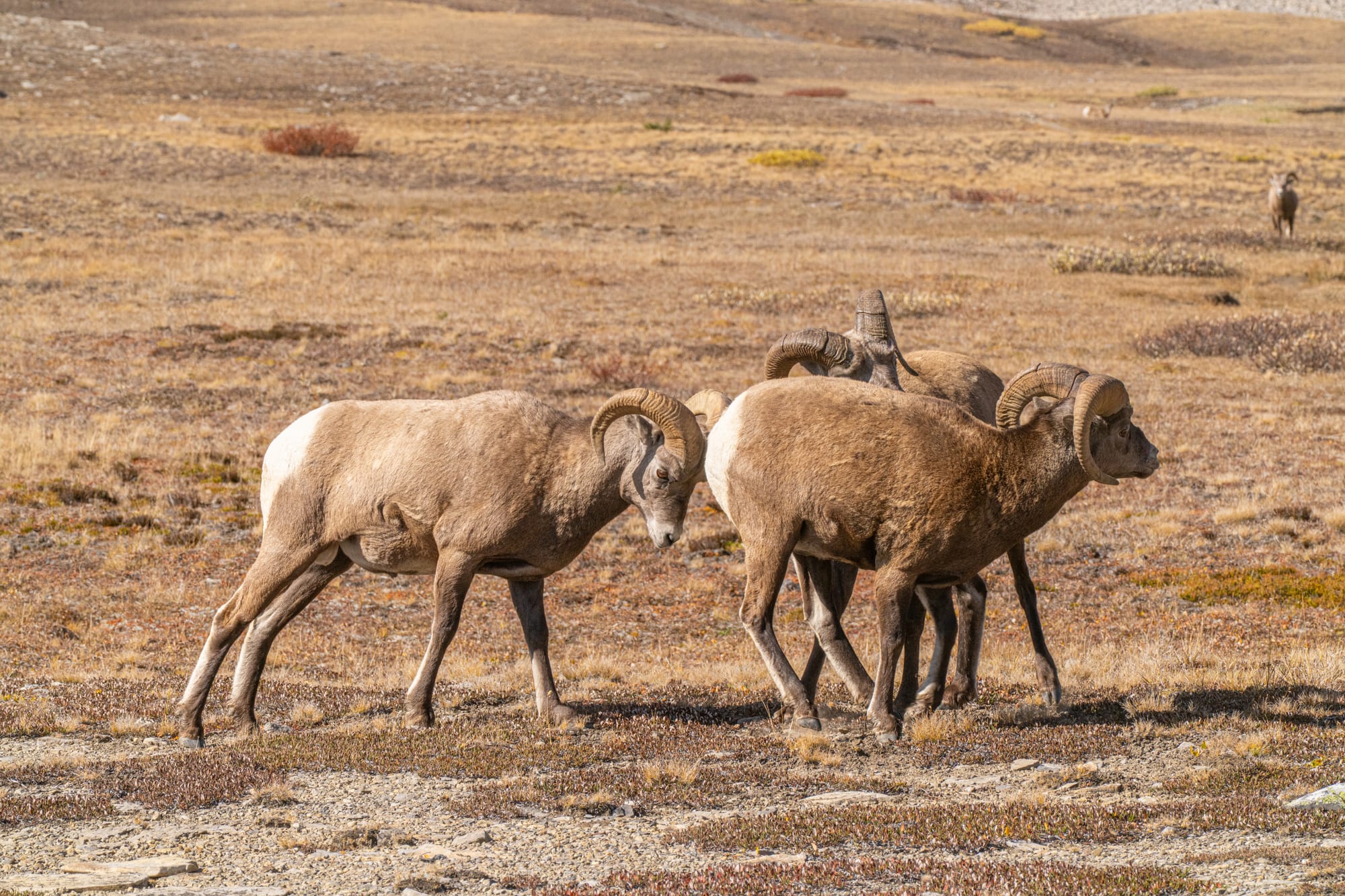 The interactions between three males is what led to the situation I mentioned at the start of the newsletter. In this case, I was with a well-known herd of males who are watched all day long by a steady stream of hikers. In general, people watch from a respectful distance, but this time it didn't matter because these three rams looked over and started quickly and repeatedly closing the gap, closely following people as they backed up step by step.